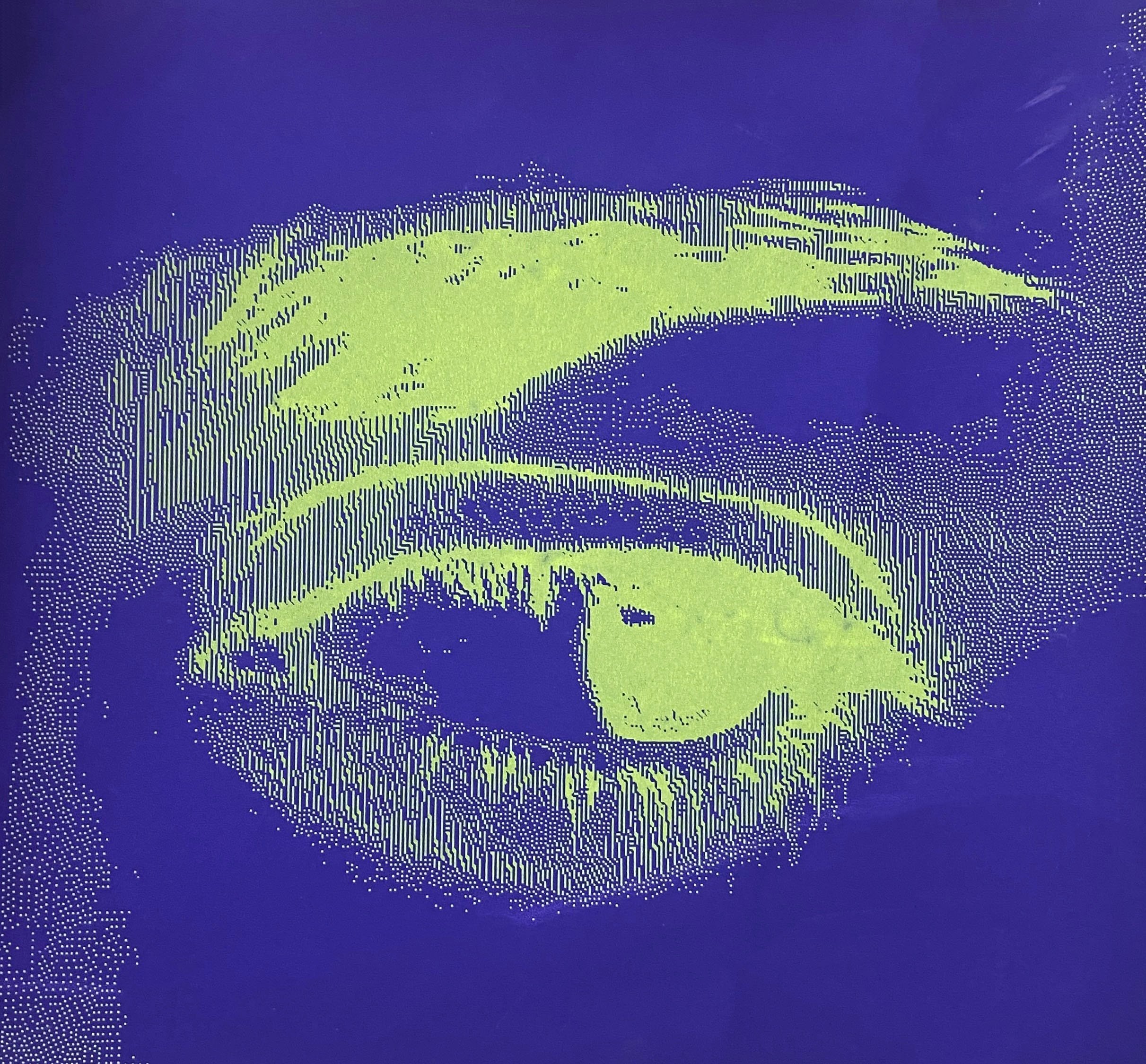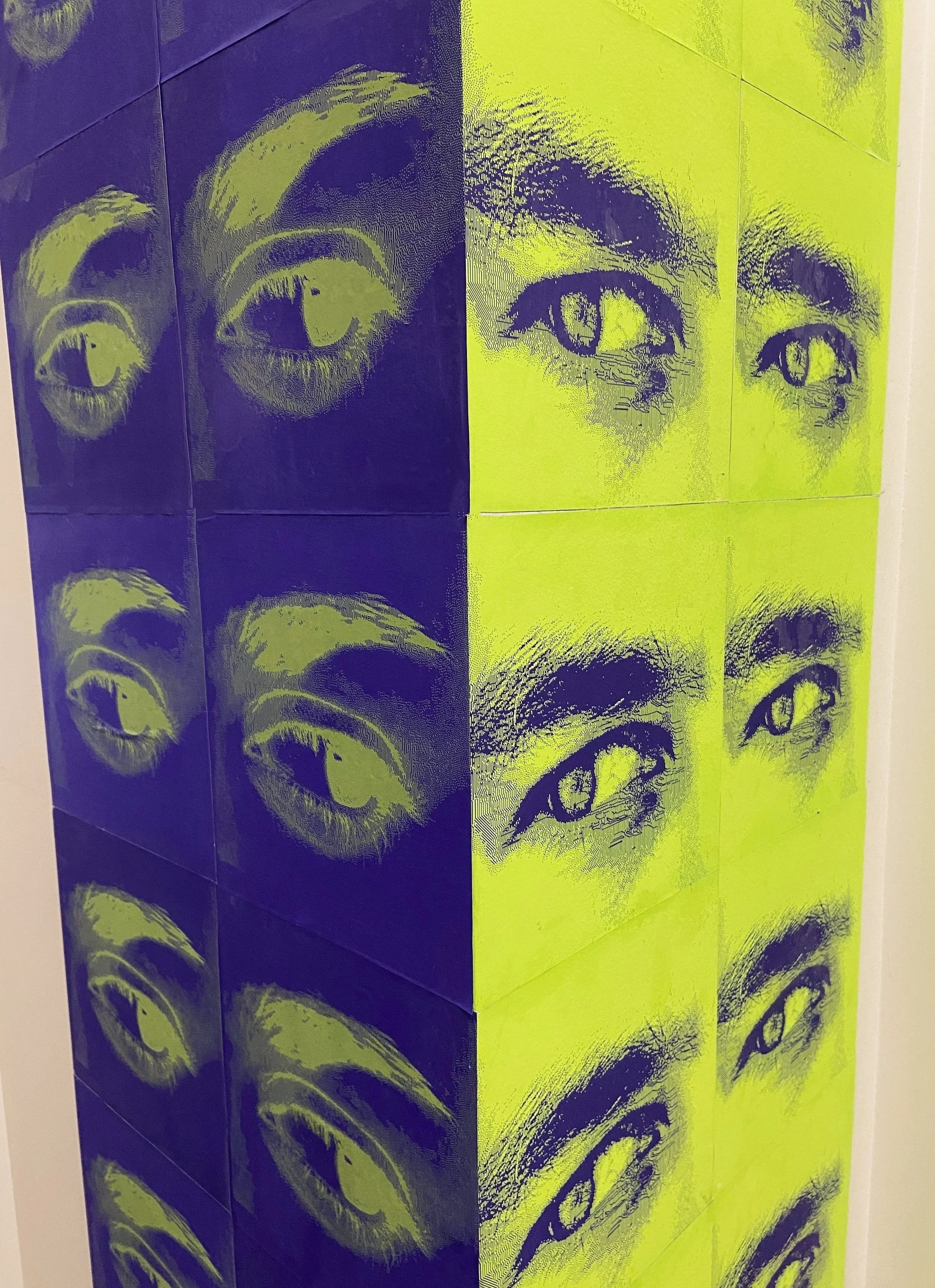 In collaboration with Sarah Schwartz (‘25). This art installation uses the contrast presented by the corner to guide the viewer’s gaze. Two eyes, generated from a photograph using a Floyd-Steinberg dithering algorithm, steal glances at each other out of the corner of their eyes. Their focus converges on the corner, establishing a sense of suspicion and tension. The strong contrast of lime green and purple makes for an electrifying visual experience, and our intentional placement of the colors also emphasizes the depth of the wall. The inversion of these colors functions to contrast the walls while unifying them under a cohesive theme.